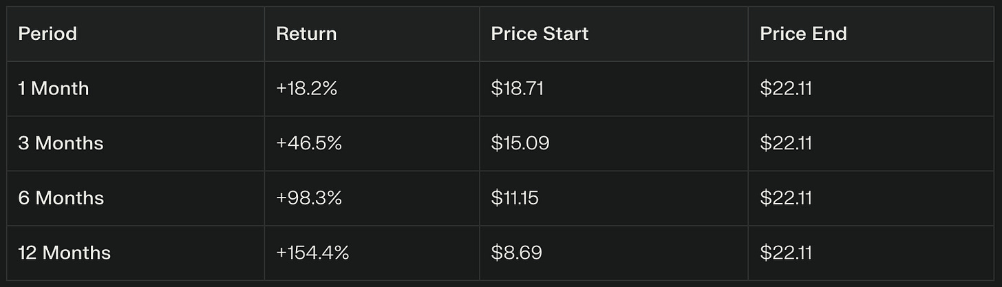 Period Return: +273% since January 2024 (from $5.92 to $22.11)