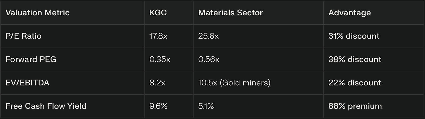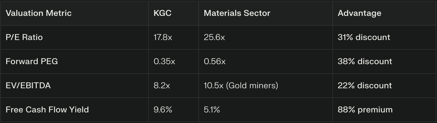 Despite strong performance, KGC trades at attractive valuations relative to both sector peers and historical metrics: