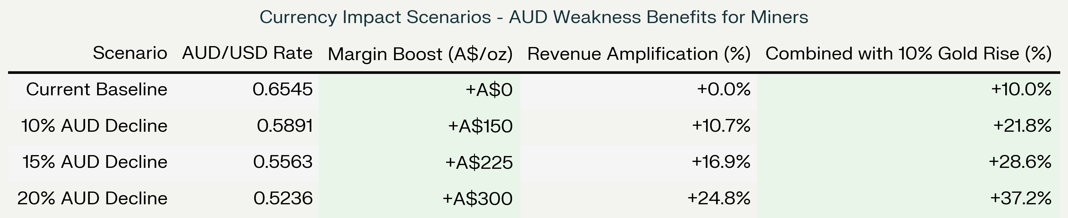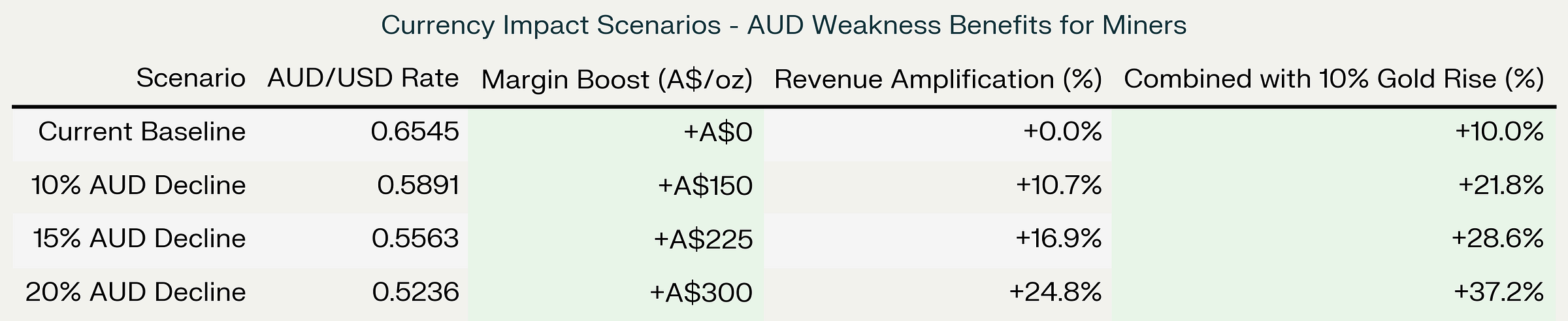 SentiFlow calculated a specific example: 10% USD gold price increase combined with 5% AUD depreciation creates a 15.8% increase in AUD-denominated gold revenue. This isn't theory—it's mathematical reality that's been playing out throughout 2025.